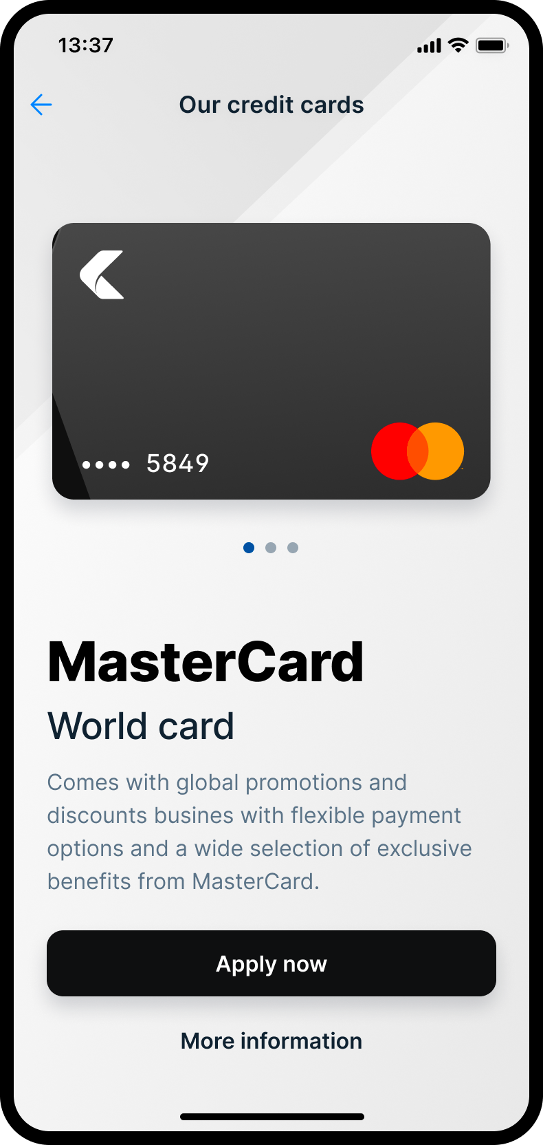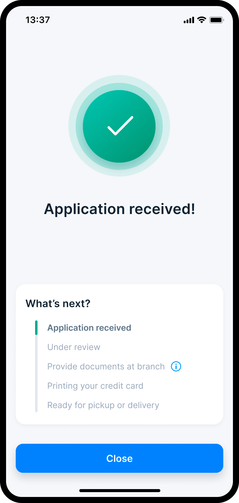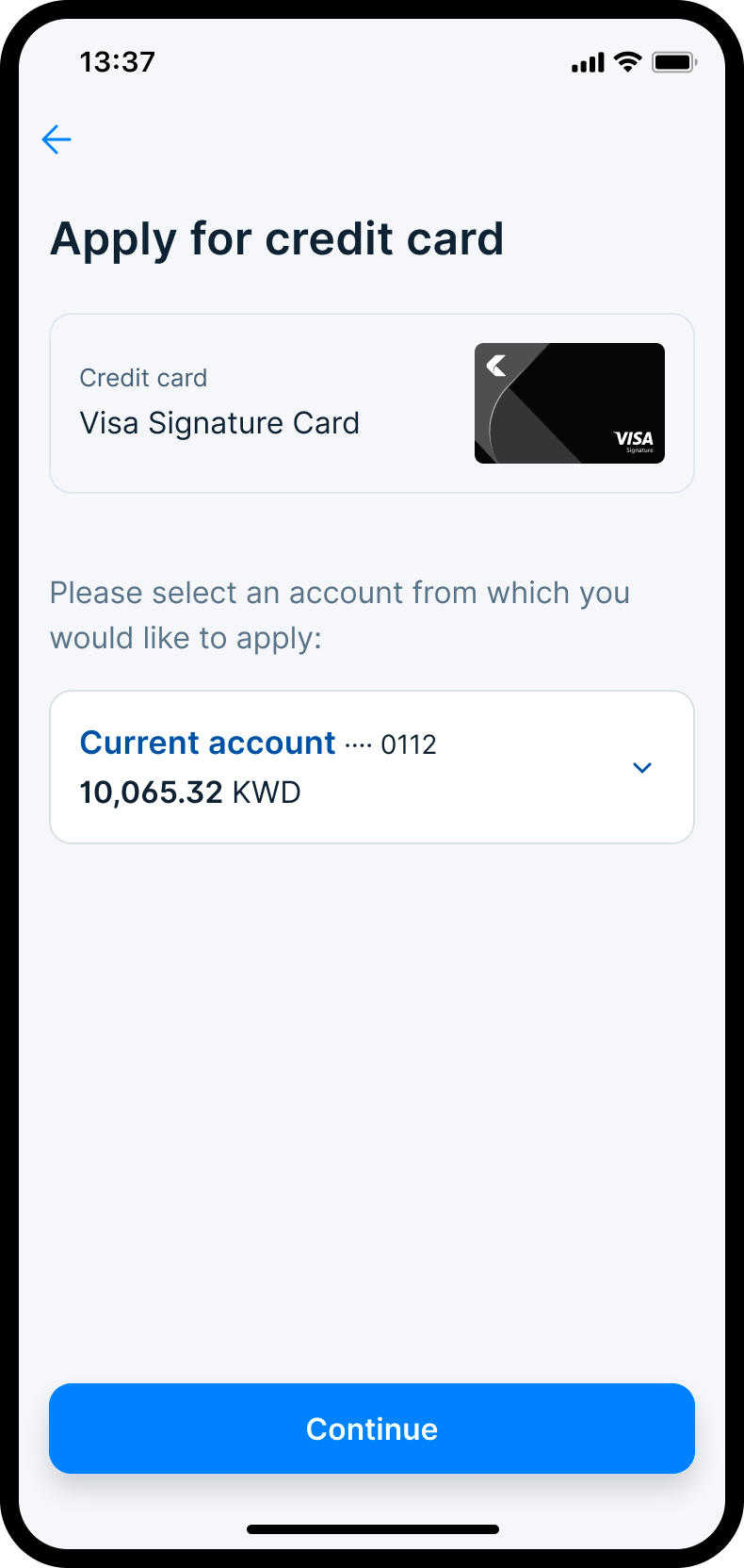 Applying for a credit card is a high-commitment action that can easily feel complex and uncertain on mobile. I designed an end-to-end experience that guides users from card exploration to submission through a clear, structured sequence, balancing product information, financial choices, and required personal details without overwhelming them. Editable review steps, transparent limit and payment selections, and a deliberate confirmation stage help users stay in control, understand what they are agreeing to, and complete the process with confidence.