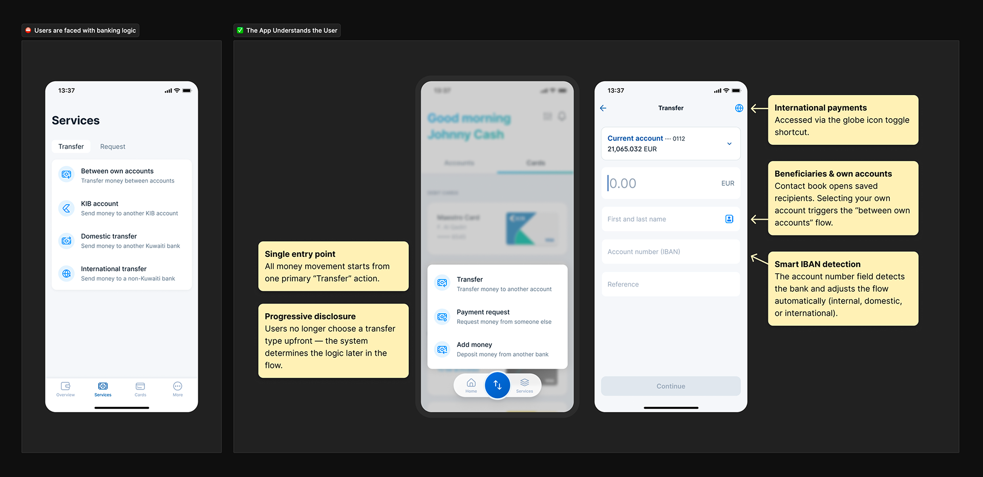 A central initiative that I proposed and developed was restructuring how the app handled money transfers. Domestic, international, internal, and own-account transfers previously existed as separate features with different entry points and form structures. This mirrored internal banking logic rather than how users think about sending money.