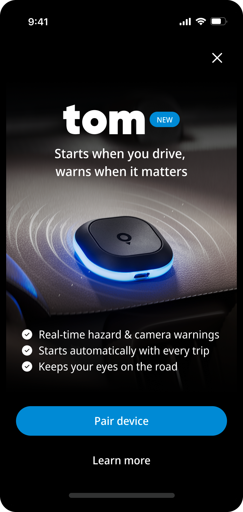 Working as a freelance product designer at TomTom in Amsterdam, I designed the mobile companion app and the interaction behaviour of their latest consumer device. The work spanned UX and UI design, device-level behaviour, and prototyping, in close collaboration with product, hardware, and engineering teams.
